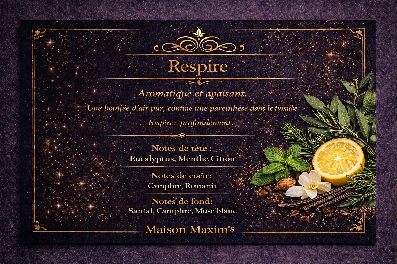 Une bouffée d'air pur, comme une paranthèse dans le tumulte de la vie quotidienne. Inspirez profondément! NOTES DE TETE: Eucalyptus/ Menthe/Citron