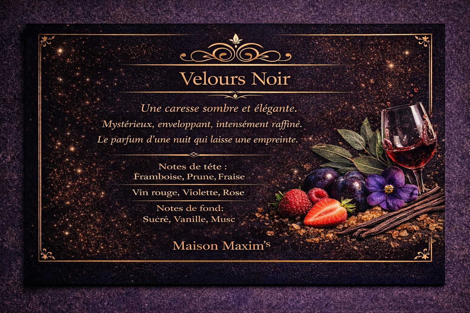 NOTES DE TETE: Framboise/ Prune/ Fraise NOTES DE COEUR: Vin rouge/ Violette/ Rose NOTES DE FOND: Sucre/ Vanille/ Musc blanc