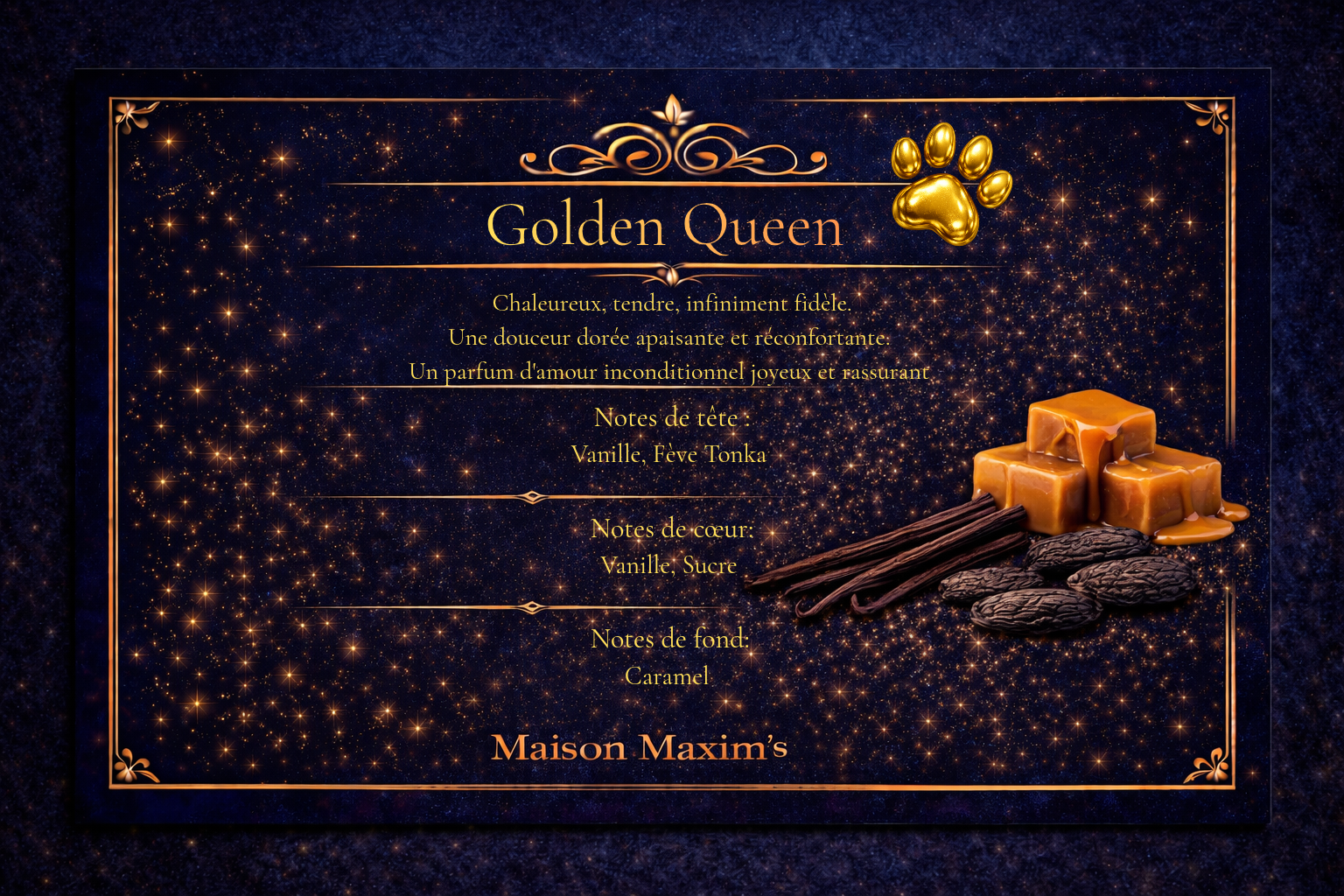 Une douceur dorée apaisante et réconfortante. Un parfum d'amour inconditionnel, joyeux et rassurant! NOTES DE TETE: Vanille/ Fève tonka NOTES DE COEUR: Vanille/ Sucre NOTES DE FOND: Caramel